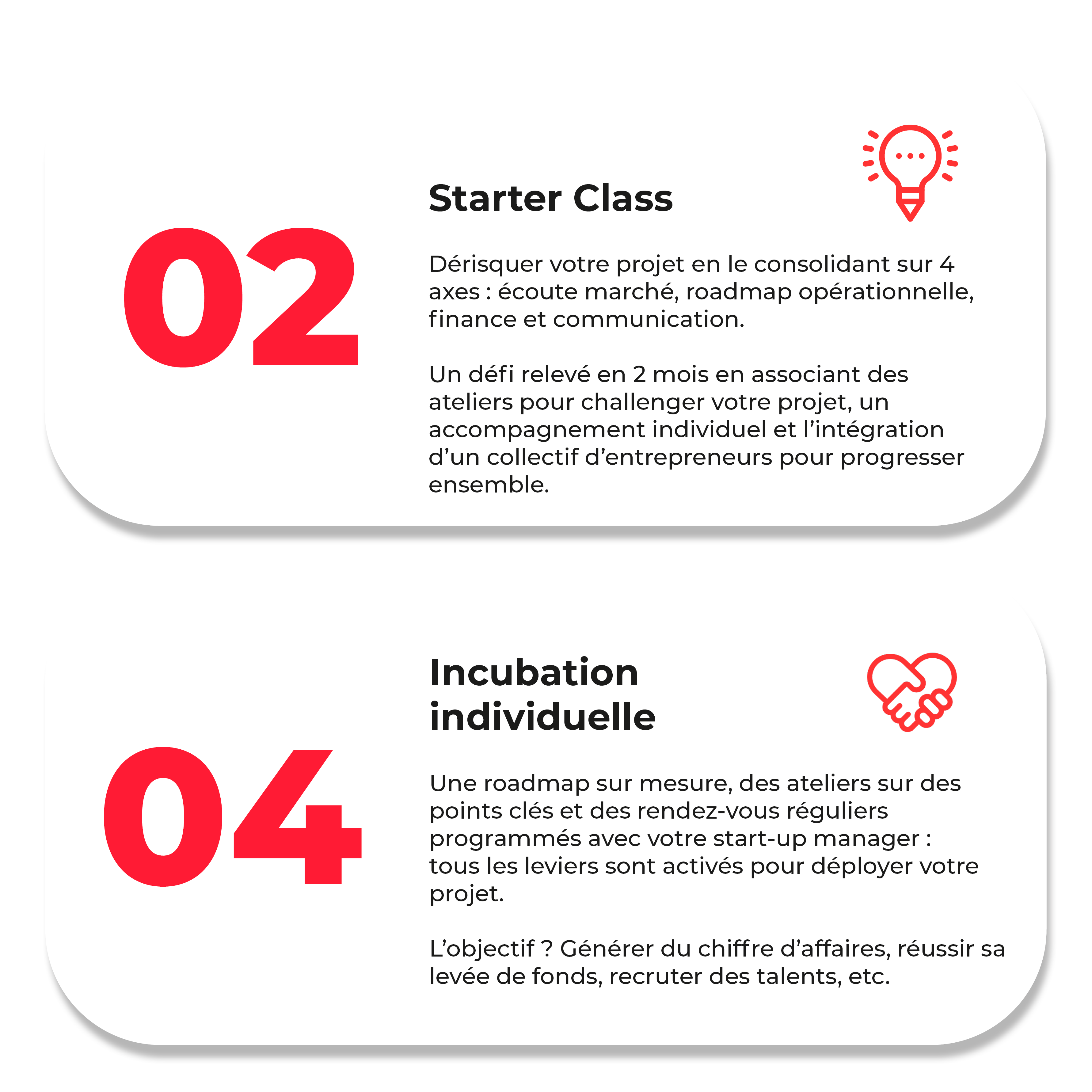 La Starter Class regroupe 10 porteurs de projets maximum par promotion. Accompagnés par un expert dédié, les entrepreneurs se retrouvent 14h par semaine pour avancer sur leurs projets respectifs tout en bénéficiant d’un collectif stimulant pour challenger leurs hypothèses, sortir de l’isolement et intégrer un réseau d’entrepreneurs engagés.